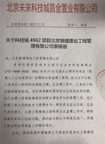 衣洪超同志自2009年入職我公司后工作勤奮努力,經(jīng)過幾年的培養(yǎng)考察,該同志于2016年12月被調(diào)到昌平未來科技城4962項(xiàng)目擔(dān)任總監(jiān)理工程師,帶領(lǐng)項(xiàng)目部全體員工團(tuán)結(jié)協(xié)作,認(rèn)真執(zhí)行相關(guān)規(guī)范標(biāo)準(zhǔn),及時(shí)有效協(xié)調(diào)參建各方,解決現(xiàn)場存在出現(xiàn)的各種問題,得到了建設(shè)單位的表揚(yáng),為我公司樹立了良好的企業(yè)形象和社會(huì)口碑。